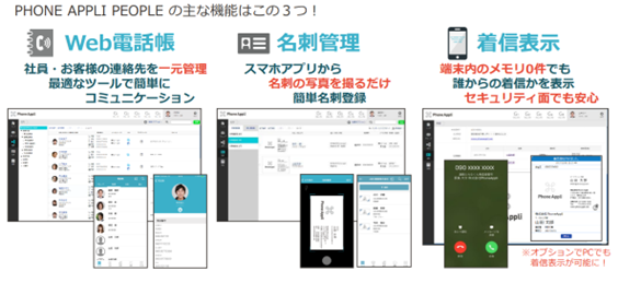 WEB電話帳 PHONE APPLI PEOPLE PHONE APPLI PEOPLEは社内外の最新の連絡先情報を一元管理できるサービスです。 いまだ紙で管理している電話番号表や、管理従業員個々人が個別登録している番号や名刺を登録することで、 情報共有になると共に、各々が個別に管理する手間とリスクを省けます。 また、従業員の経歴や保有スキルを登録できるので、どなたが担当かをスキル等から調べる事も可能です。 ・社内外の連絡先が、外出・テレワークしているとわからない。 ・仕事で困った時にだれに聞けばいいのかわからない。 ・セキュリティ上スマホに連絡先を登録したくない。 そんなお悩みを解決してくれます。